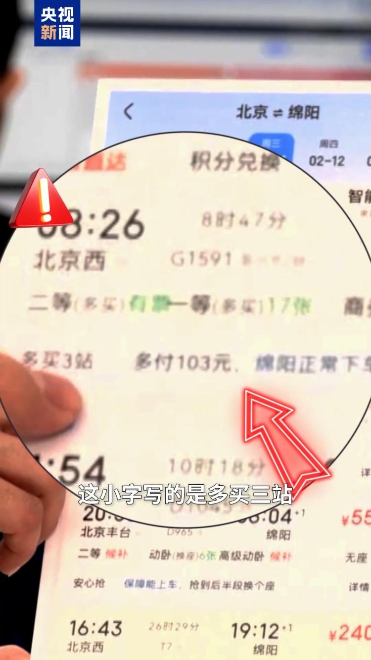 央视记者郑连凯:前两天我的同事遇到了一个新问题。我去绵阳出差。我在网上买票时发现,2月11日12306的票大部分都被搁置了,但票务检索软件却显示还有票可用。我应该相信谁?铁道科学院电子研究所智能数字客运实验室 赵前一:你仔细看看这张照片。购票软件显示你有票,但下面其实是一行小字。细则上写着再购买3个电台并额外支付103元。你是什么意思?它鼓励购买长途列车,乘坐短途列车,让乘客花更多的钱购买更远的车站,并在自己想要下车的车站下车。事实上,我建议不要这样做,我们强烈鼓励乘客这样做。因为花很多钱买额外的东西一个座位实际上浪费了该座位上的资源,并且阻止了真正需要它的乘客购买机票。还有一件事,最下面写着一个小字。 “保证能上车,所以坐下半程吧。”这是购票软件为了吸引乘客在短时间内购买的又一个伎俩。买空做多是什么意思?即乘客购买短途车票,乘坐公交车,然后支付车票到达目的地。这种方法尤其危险,因为每列火车可运载的人数有一个安全上限。如果每个人都这样做,火车就会超载。严重的情况下,列车可能会中途停车,影响整条线路,影响所有乘客的行程。还有一个方法。有些购票程序会推荐明显非常不合理的转乘方案,并注明有票。事实上,转移r时间很短。如果乘客速度慢一点,他们可能会错过跟随他们的火车。 (央视记者 翟娟 孔维娜 郑连凯 陈曦 张浩)