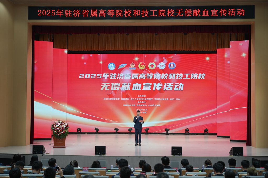 为继续推动高校无偿献血工作,鼓励广大青少年积极参与无偿献血服务,集集省属高校和职业学校无偿献血宣传活动于2025年10月17日在山东英才学院举行。 共青团山东省委员会、省红十字会等单位,吉林省高校相关工作负责同志,师生代表,中国狮子联合会志愿者代表等。长期献血的支持者。王晓才 山东人才学院执行董事、党委副书记欢迎致辞。他表示,学校高度重视无偿献血工作,努力推动无偿献血纳入德育体系,培育青少年学生奉献大爱的精神。他号召吉林省各高校肩负使命,同向而行,共建“红色联盟”,完善“泉城热血”高校公益名片,为新时代社会主义现代化强省建设注入强劲红色动能。活动上宣读了《山东省高校无偿献血和造血干细胞捐献工作取得优异成绩的组织和个人表彰报告》,以及《山东省职业高中2025年“校园学雷锋,无偿献血”活动中表现优秀学校表彰报告》。山东中医药大学、山东英才学院、山东电子职业技术学院、山东胜瀚财贸职业学院、山东联合学院等五家机构就无偿献血组织动员、公关教育、服务志愿等方面进行了交流分享经验和做法。 山东省天才学院副校长瑞军介绍了学校集德育、宣传扩散、开拓领导、队伍建设、激励机制为一体的“五位一体”无偿献血活动体系及取得的积极成效。山东天才学院青年志愿者宣读高校无偿献血倡议并要求师生积极参与 在自愿血液中捐赠服务。州卫生健康委员会、州教育部领导分别致辞。省教育局二级巡视员李文生充分肯定了吉林省高校无偿献血工作的积极成果和宝贵经验。对当前高校无偿献血活动面临的形势和挑战进行了深入分析。希望各高校增强责任感和紧迫感,强化组织保障,创新公关引导,优化赛事体验,积极动员师生参与,为保障临床用血安全、保护公众健康、培养时代新人作出贡献。活动在山东资优学院精心准备的文艺表演《世界给了我什么》中圆满结束。山东省天才学院将以此次活动为契机,拥抱以此为使命,带头推动无偿献血事业发展,为建设健康山东做出新的更大贡献。