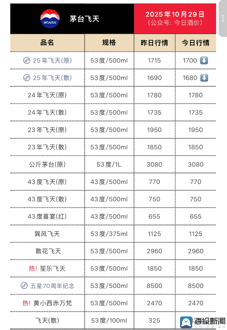 海报新闻记者秦文济南报道,2025年10月29日,白酒市场监测平台“今日酒价”数据显示,飞天茅台53度500ml散装瓶标准批发价为每瓶1680元,首次跌破1700元大关,较前一日下跌10元,创上市以来最低价格。该盒原价每瓶1700元,一天之内跌了15元。与今年年初2220元/瓶、2255元/瓶的高价相比,两款产品累计跌幅均超过24%。这种从今年年中开始的价格下降趋势正在高端烈酒市场引起连锁反应。价格防线不断消失,距离公布价格又近了一步。今年以来,以飞天为代表的茅台山价格持续下跌。春季期间节后,飞天茅台市场价格维持在每瓶2290元。 6月11日,茅台散瓶批发价首次跌破2000元/瓶的重要心理关口。此后价格持续下跌,6月22日跌破1900元/支,6月25日跌破1800元/支。国庆、中秋假期后,飞天茅台市场价格再次下跌,维持在1780元/瓶左右。 10月底,价格终于突破1700元/本,距离官方参考价1499元/本仅一步之遥。 10月29日《烈酒现价》数据显示,53500ml瓶飞天茅台批发参考价为每瓶1680元,较前一交易日再次下跌。事实上,消费者组织的反复更新已经对酒精饮料市场产生了结构性影响。根据电子报的数据电商平台显示,2025年中秋节35岁以下用户饮酒比例不足18%,较上年下降7个百分点。 Z世代对高度烈酒兴趣减弱,低度果酒和预调酒的市场份额从2020年的5%增长到22%。年轻消费群体口味的变化进一步压缩了茅台的市场空间。与此同时,大众消费的价格区间不断缩小,100-300元的价格区间成为主流。自消费需求和高端酒类赠品消费增速均放缓。 10月29日,飞天茅台在拼多多平台的价格将是当天所有平台的最后价格。这是一个很低的价格。更值得注意的是渠道变化的影响。各大电商平台“双十一”促销期间,茅台酒价格持续下跌。 10月29日,飞天茅台在拼多多平台的补贴价低至两瓶3180元,相当于一瓶1590元的价格,甚至低于传统市场的批发价。这种“价格倒挂”现象直接打破了传统分销体系的定价逻辑。这一新低恰逢茅台新掌门人官宣。值得注意的是,此次提价恰逢贵州茅台发生重大人事变动。 10月28日,贵州茅台正式宣布总裁职务变动。该公司原总裁张德勤因工作调整,已请求辞去职务。根据贵州省人民政府相关文件,陈华被推荐为贵州茅台董事、总裁候选人。张德钦先生任职期间(2024年4月至2025年10月),费特茅台批发价出现较大波动,但贵州茅台整体业绩仍保持稳定增长。公司2024年营业利润总额为1741.44亿元,同比增长约15.66%。净利润约862.28亿元,较上年增长约15.38%,预计实现全年15%的增长目标。 2025年上半年销售额910.94亿元,同比增长9.16%。归属于母公司净利润4540.3万元,比上年增长8.89%,基本符合全年9%的经营目标。 10月28日上午,茅台集团新任党委书记、董事长陈华在赤水河2025论坛上“首秀”。这是他首次在茅台系统内公开露面并发表讲话。陈华表示,茅台始终践行““善待自然、尊重人、懂事、讲道德”,牢固树立“质量是生命的灵魂”的质量信念。我们坚持传统工艺,弘扬工匠精神,始终保持茅台酒的优良品质。 “坚守传承,是一代又一代葡萄酒企业永恒的使命。”陈华表示,茅台酒始终愿与酒业同仁携手合作,坚守品质初心,传承文化根基,打造酒业发展的生命之魂和根基。记者仔细观察发现,陈华的讲话主要围绕茅台的企业价值观和开放共享发展理念,并未提及与企业运营相关的内容。产品价格的持续下滑以及经销商与市场信任的动摇仍将是企业不可避免的核心问题贵州茅台酒工业.下一个趋势会是什么?国泰海通的研究报告指出,繁忙的中秋节和国庆假期期间的销售逐月恢复,但与去年相比缓慢。行业仍处于“低预期、低现实”状态,“双十一”促销和出货重叠,价格波动风险可能加大。但长期来看,随着“去金融化”的推进以及投资需求占比下降至合理水平,茅台酒价格有望稳定在1700元至2000元/瓶区间。值得注意的是,行业重组已经出现变化迹象。一些经销商已经开始向特定的酒类饮料扩张,通过盈利的产品来填补茅台销量下滑留下的空白。电商平台也在减少茅台促销力度,逐步转移资源到其他酒精饮料类别。从历史角度看,当前三个月渠道库存状况较6-8月期间更为健康。2012年白酒冬季,但经销商利润已压缩至五年低点。市场关注的焦点是即将到来的春节旺季是否会成为转折点。业内专家表示,业内普遍认为,茅台酒厂“长盛不衰”的神话已经彻底破灭。这次价格调整本质上是行业从“渠道驱动”转向“消费驱动”的必然阵痛。一旦泡沫结束,价值最终会回归到消费的本质。