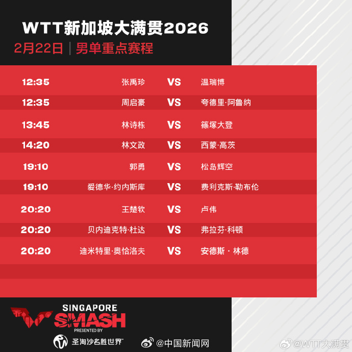 2026 年 WTT 新加坡大满贯正赛将于今日(22 日)开赛。第一天有来自全国各地的八名乒乓球运动员参加。具体赛程如下: 男单 12:35 温瑞波 VS 张玉珍 12:35 周启豪 VS 夸德里阿鲁纳 13:45 林诗栋 VS 筱冢大翔 20:20 王楚庆 VS 卢伟 女单 13:45 秦雨轩 VS 桥本帆野 14:20 王曼昱 VS 曾健 14:20 陈欣桐VS TBA 19:45 陈怡 VS 索菲亚·波尔卡诺娃(世乒联WTT微博)