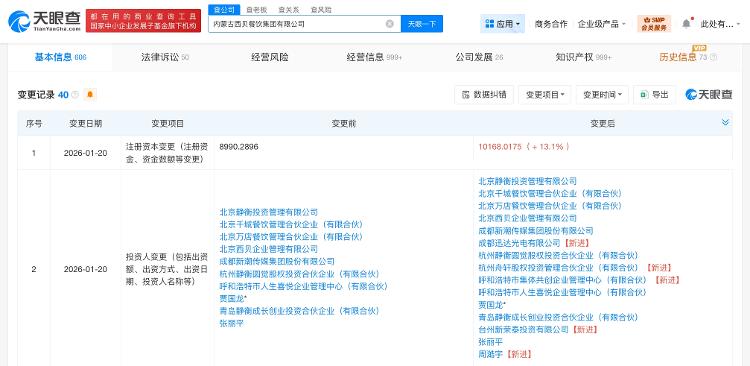 中国VS新加坡经纬1月21日讯 据车天眼查工商信息显示,内蒙古西北餐饮集团有限公司近日发生工商变更,股东新增台州欣荣泰投资有限公司、呼和浩特集团共创企业管理中心(有限责任公司)、杭州洲轩股权投资管理合伙企业(有限责任公司)等。同时,公司注册资本由约8990.3万元增至约1.02亿元,增幅约13%。资料来源:天眼茶 据天眼茶介绍,内蒙古西北餐饮集团有限公司成立于2017年10月,法定代表人为贾国龙先生。公司业务活动包括餐饮服务、食品制造、网上食品销售、食品销售、管理餐饮、总公司管理及自筹资金投资活动。据沙持证人信息显示,该公司由北京西北企业管理有限公司、贾国龙、呼和浩特生活喜悦企业管理中心(有限责任公司)等共同持有。台州欣荣泰投资有限公司成立于2009年,法人实体为中式餐饮连锁企业“欣荣记”创始人张勇先生。