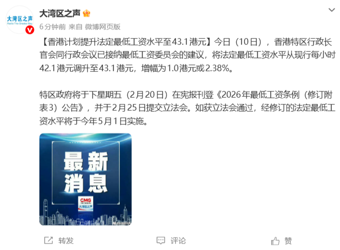据@大湾区之声报道,2月10日,香港特别行政区行政长官会同行政会议接受最低工资委员会的建议,将法定最低工资水平由现时每小时42.1港元提高至每小时43.1港元,增幅1.0港元或2.38%。特区政府将于下周五(2月20日)在政府公报刊登《2026年最低工资条例公告(附表3修订)》,并于2月25日提交立法会。如获立法会通过,修订后的法定最低工资水平将于今年5月1日生效。来源:@大湾之声